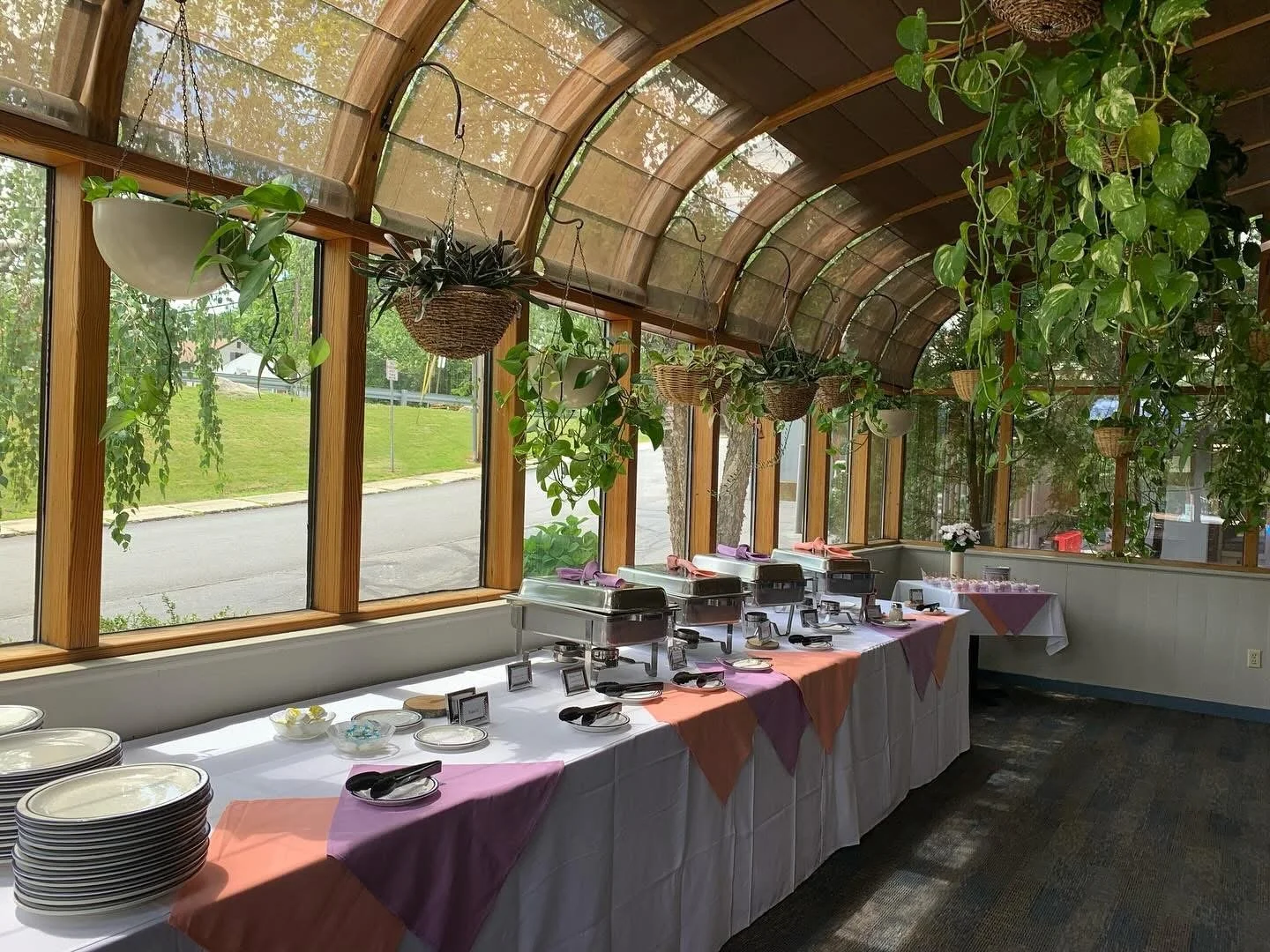Buffet table set with chafing dishes, plates, cutlery, and colorful napkins in a bright, plant-filled room with large windows and hanging potted plants.