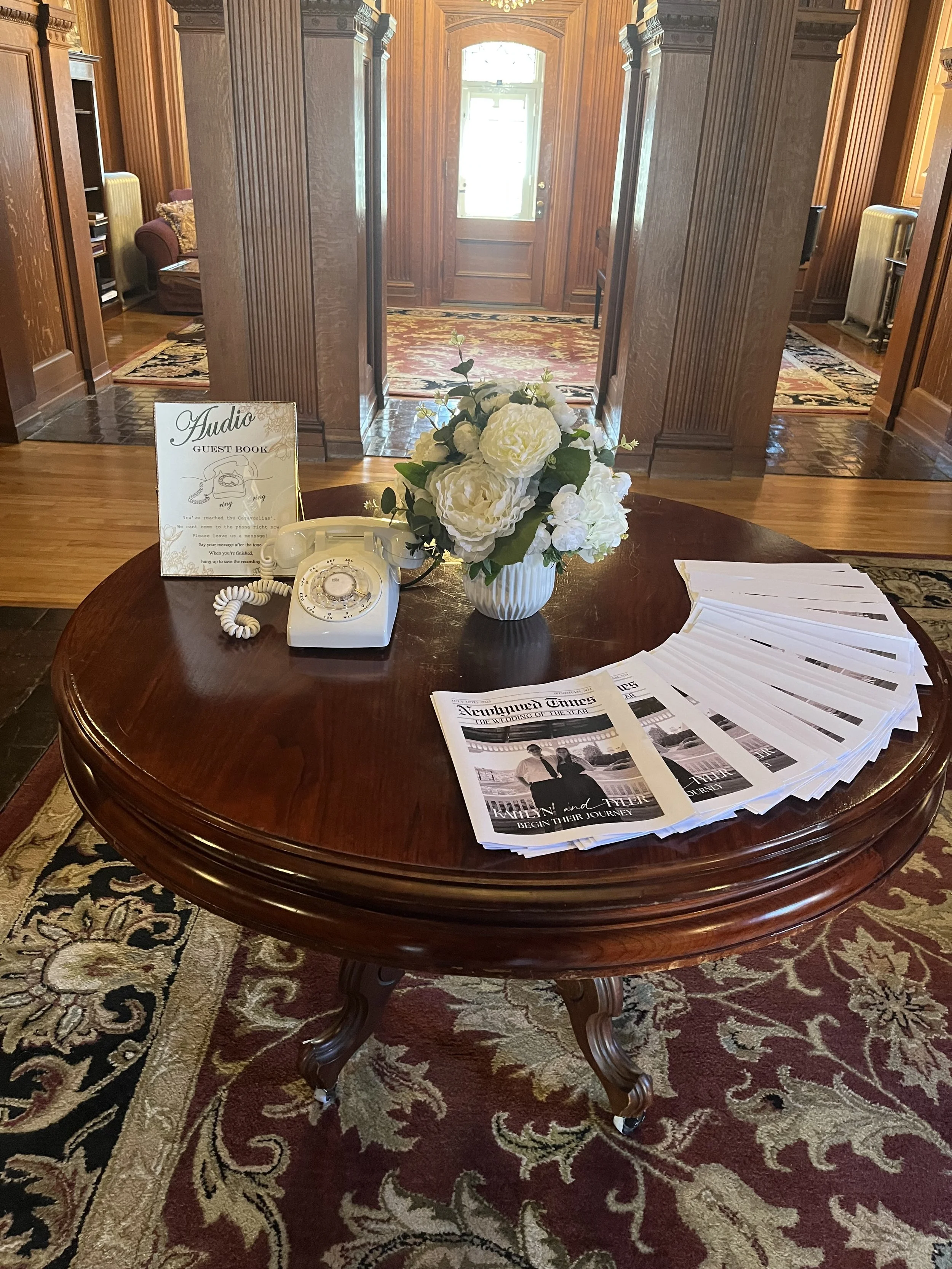 A round wooden table with a bouquet of white flowers, a vintage telephone, and a stack of newspapers, with an audio guest book sign, in a warm wood-paneled room with an open doorway and seating area in the background.