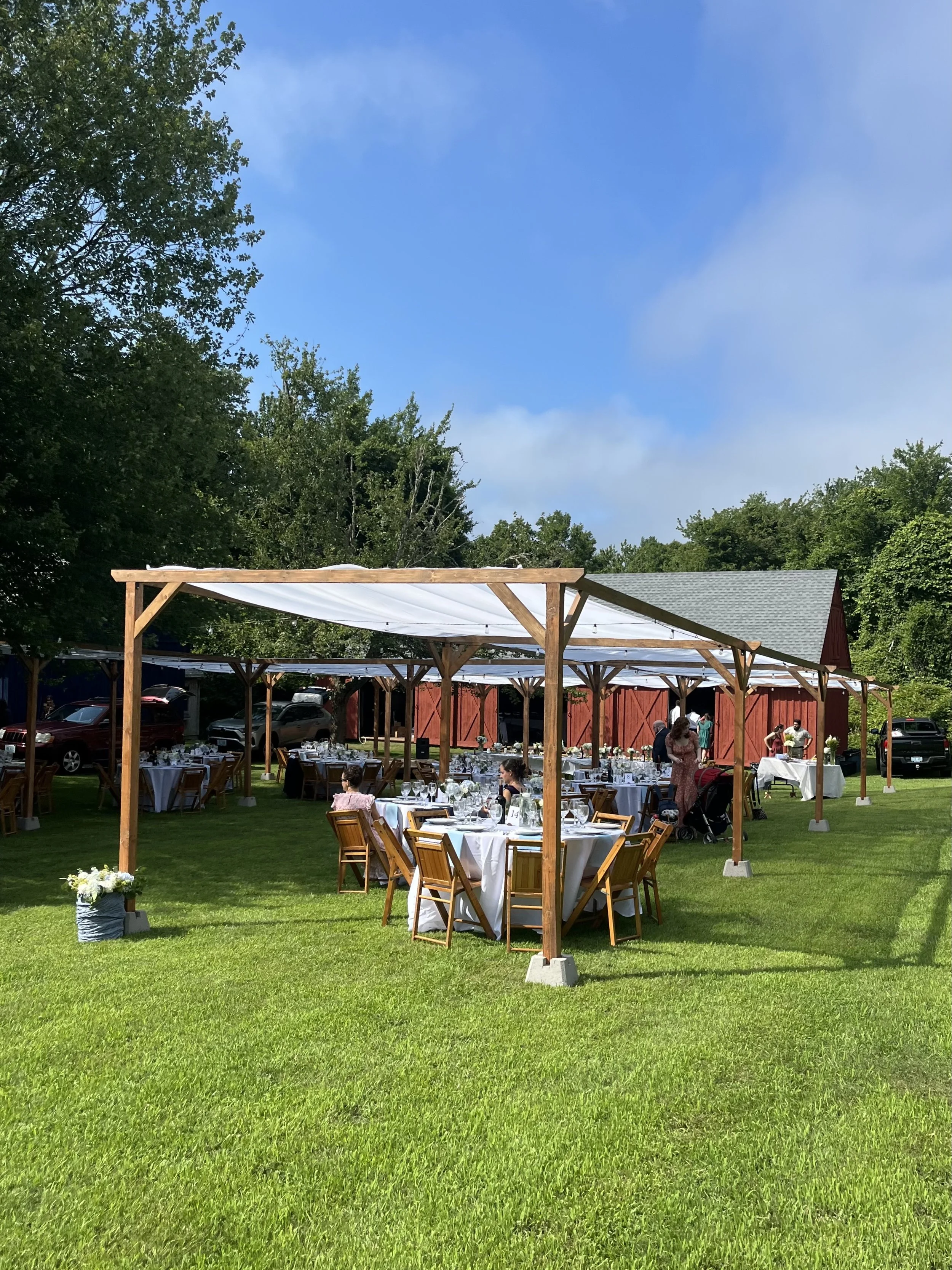 Outdoor wedding reception area on a sunny day with round tables covered in white tablecloths and wooden chairs, under a wooden canopy with a white fabric cover, on a grassy lawn with trees and a red barn in the background.