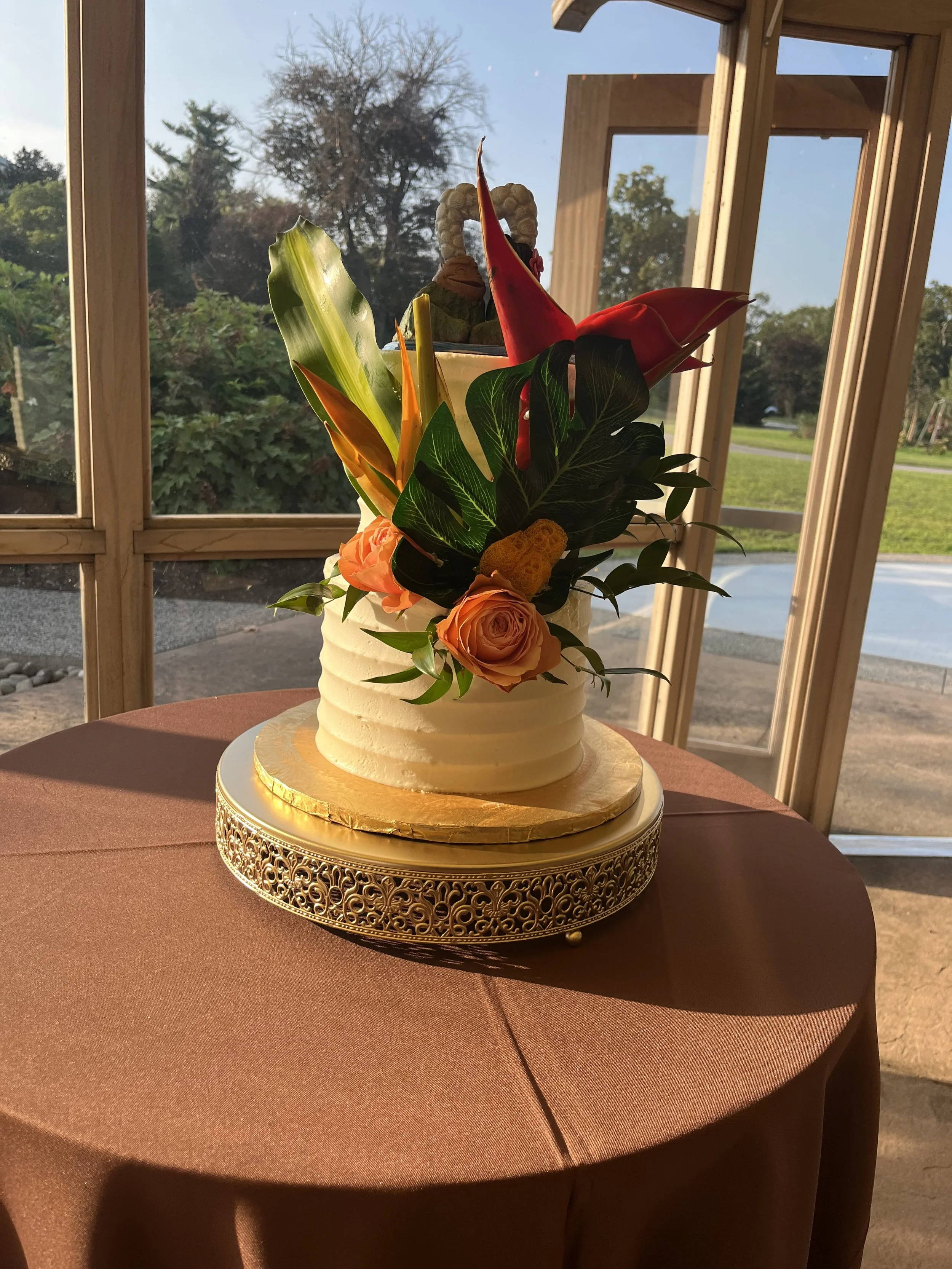 A decorated cake with fresh flowers and greenery, placed on a round table covered with a brown tablecloth. The cake has a smooth white icing with various colorful flowers and leaves on top. It is positioned in a room with wooden framing and large win