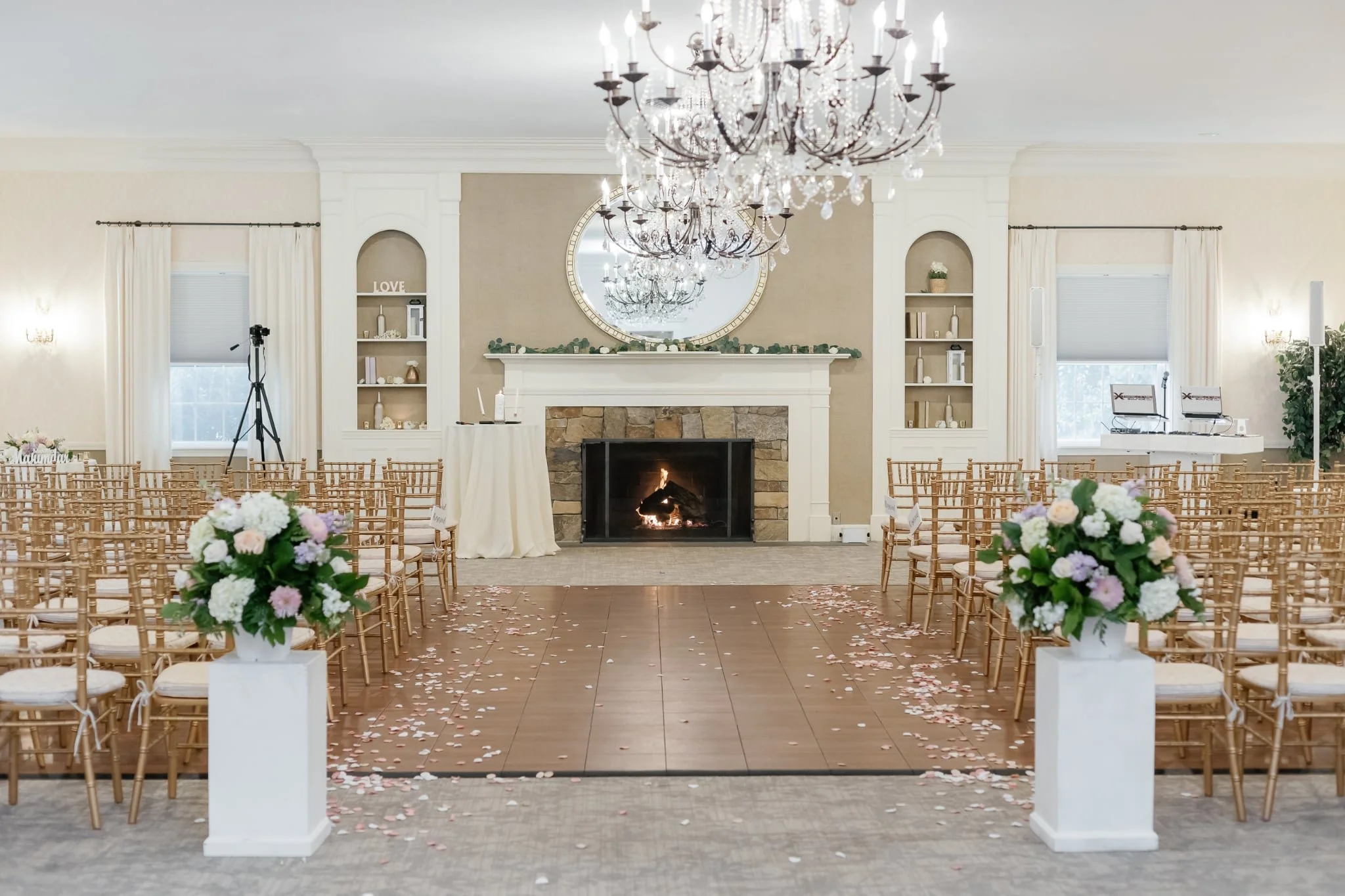 Elegant indoor wedding ceremony setup with wooden chairs, floral arrangements, and a stone fireplace with a mirror above, pink and white flower petals scattered on the wooden floor, chandeliers hanging from the ceiling.