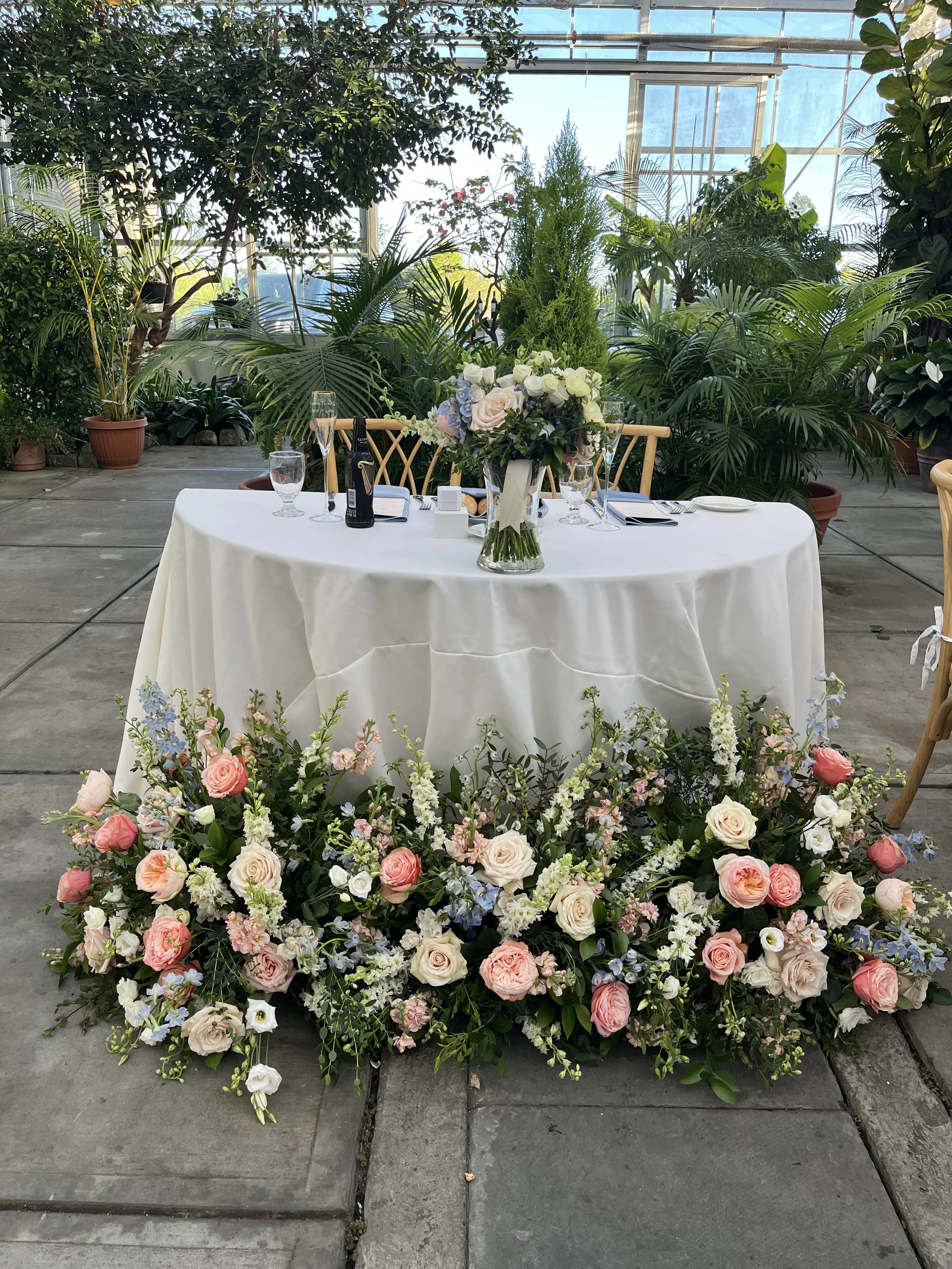 A beautifully decorated round table with a white tablecloth, set with glasses, a floral centerpiece, and a floral arrangement border made of pink and white roses, surrounded by lush green plants in a greenhouse or conservatory setting.