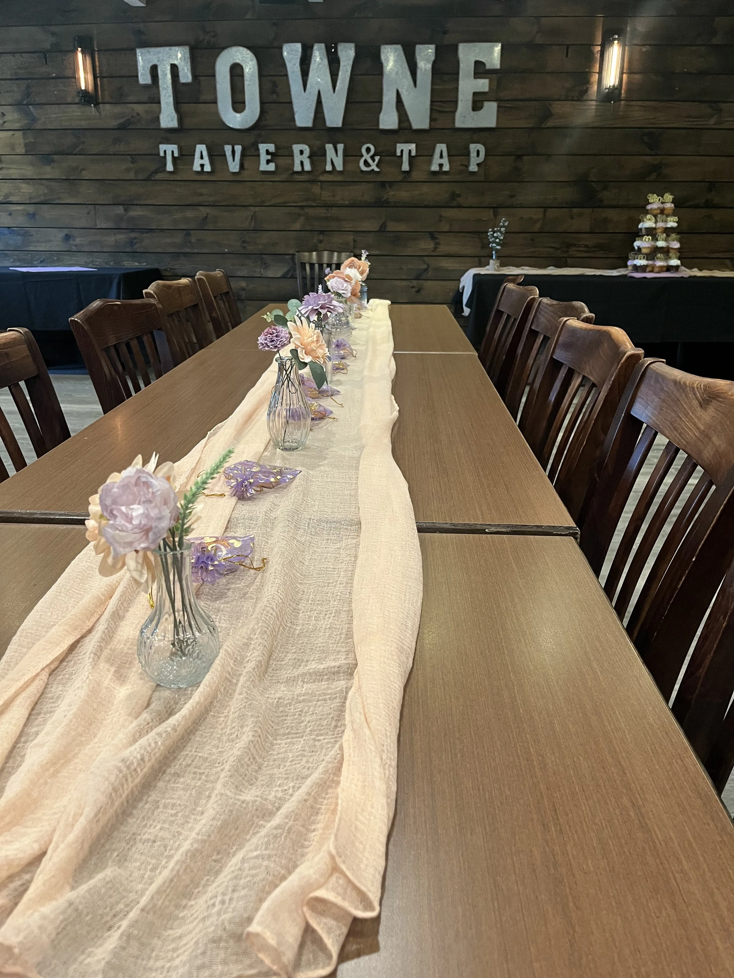 A decorated dining table with a light-colored fabric runner, small vases with pink and purple flowers, and purple butterflies, in front of a dark wood wall with the sign 'TOWNE TAVERN & TAP' in large metal letters.