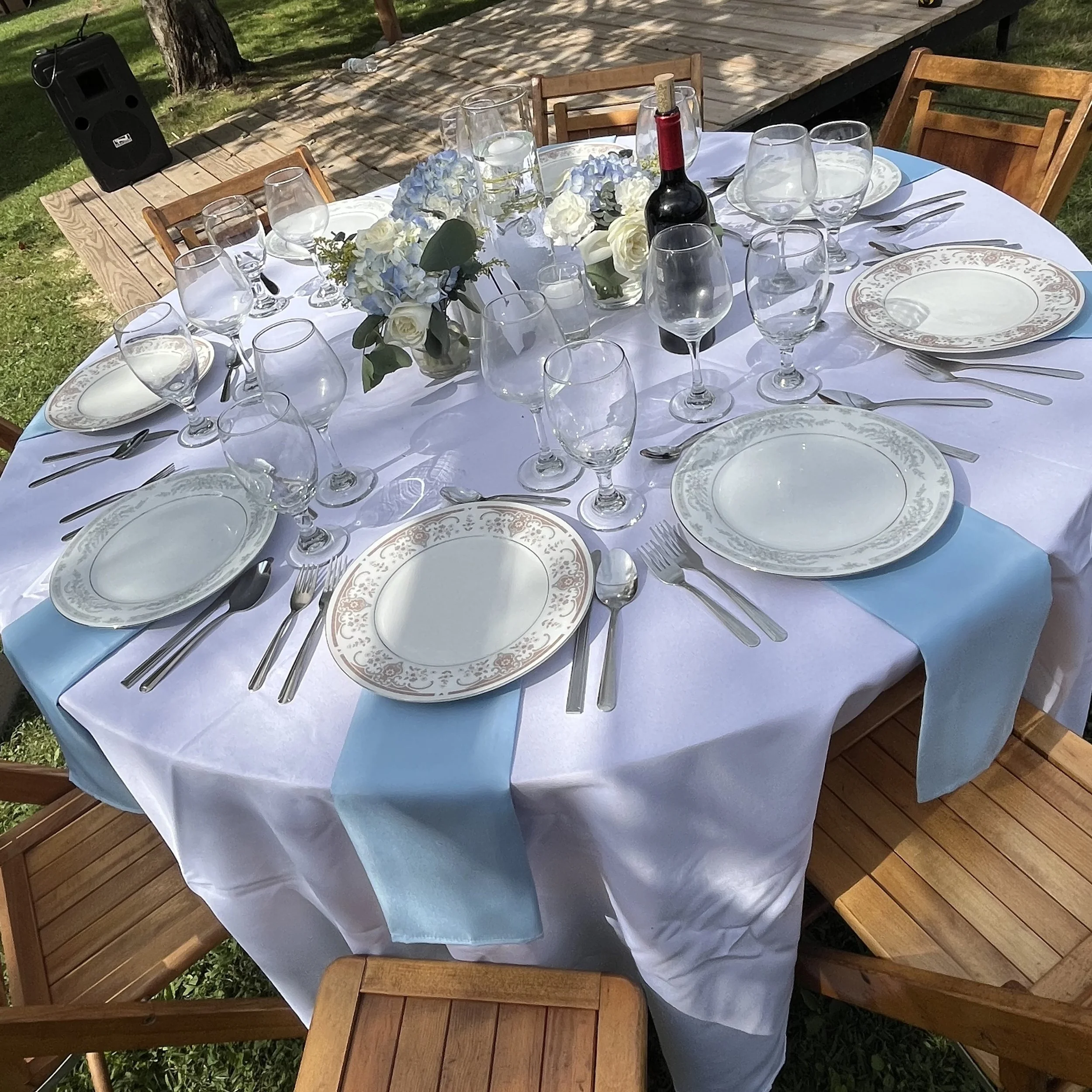 A round outdoor dining table set for a meal with white tablecloth, blue napkins, white and patterned plates, wine glasses, silverware, and a centerpiece of white and light blue flowers, surrounded by wooden chairs, in a grassy area with trees and a w