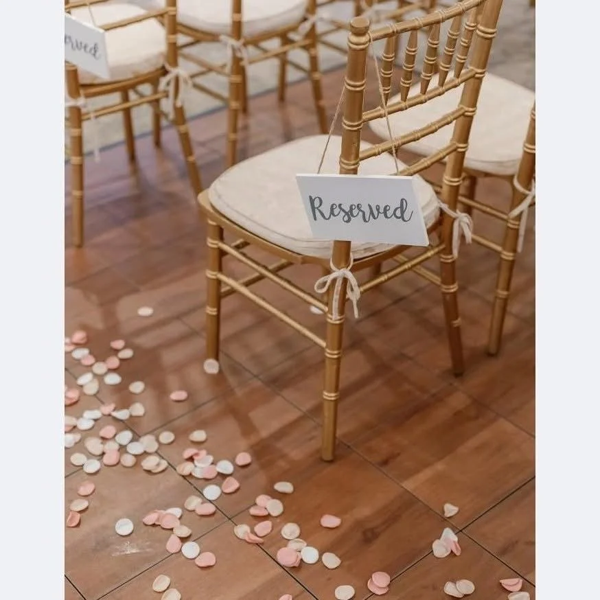 A reserved sign hanging from a wooden chair at a decorated event with pink and white confetti scattered on the wooden floor.