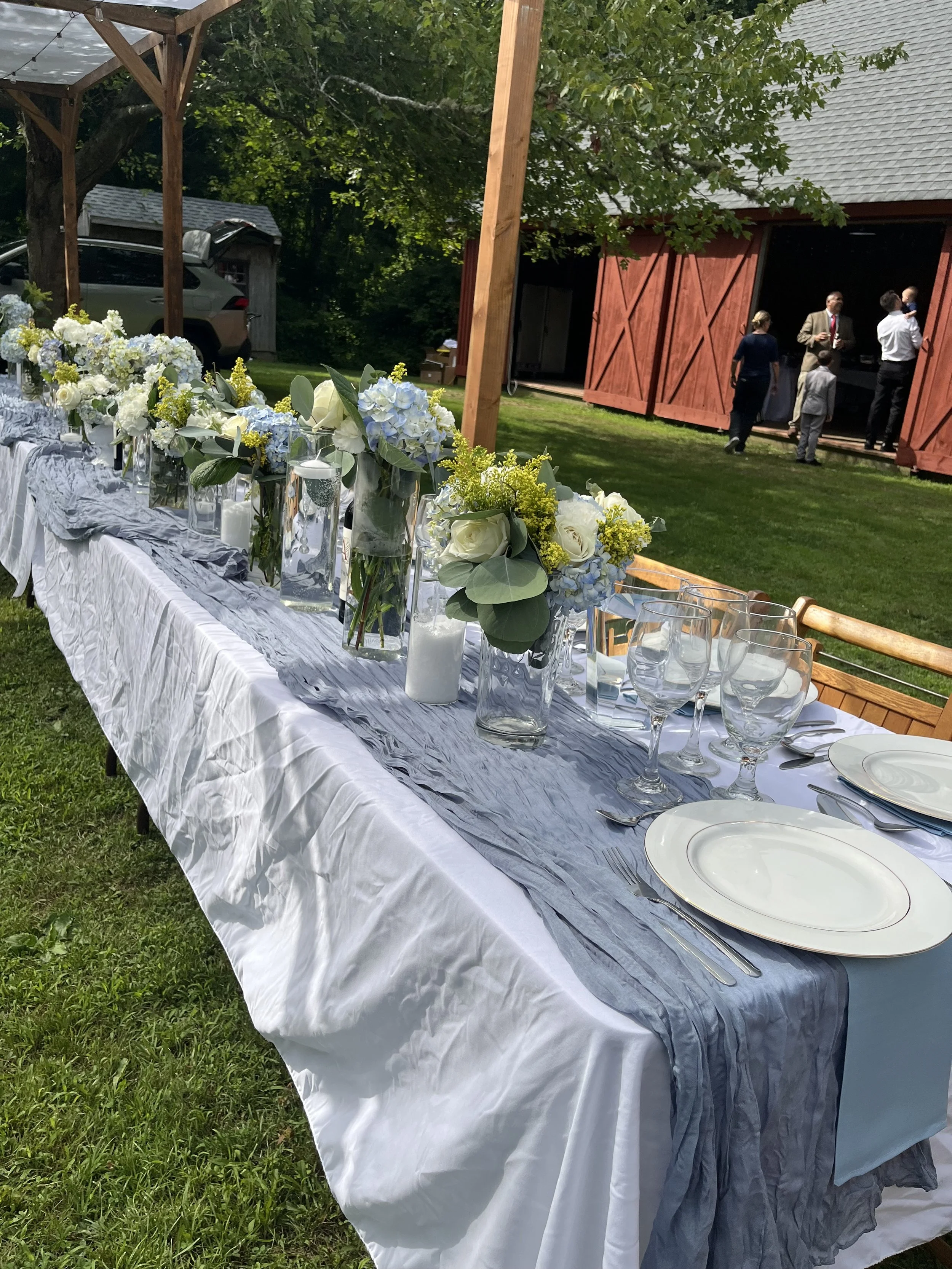 Outdoor wedding reception table decorated with white tablecloth, gray runner, floral centerpieces in glass vases, and place settings with white plates and glassware. People are gathered near a red barn in the background.