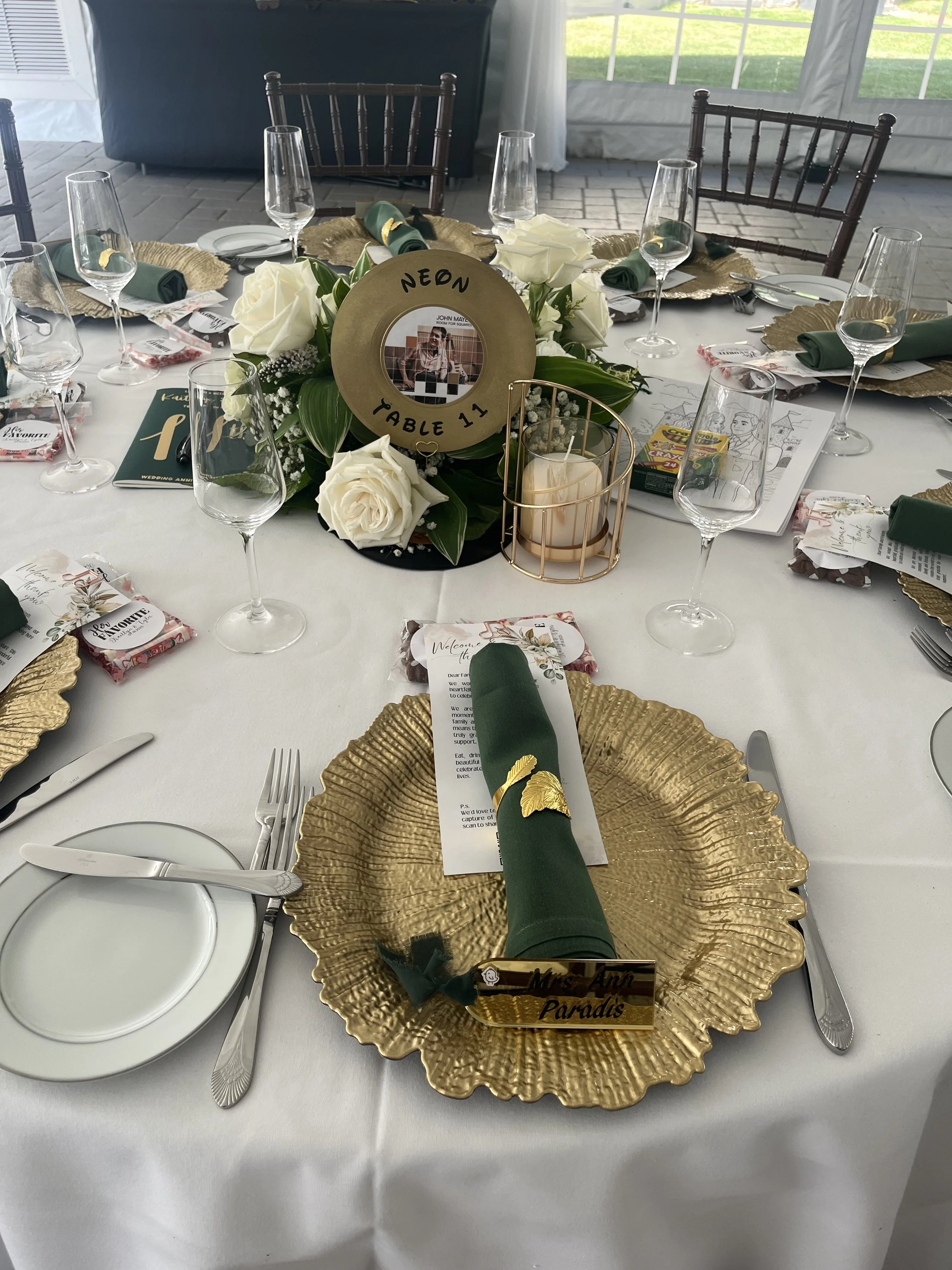 Wedding reception table with gold charger plates, green cloth napkins with gold leaf napkin rings, white roses and greenery centerpiece, champagne glasses, place cards, and candles.