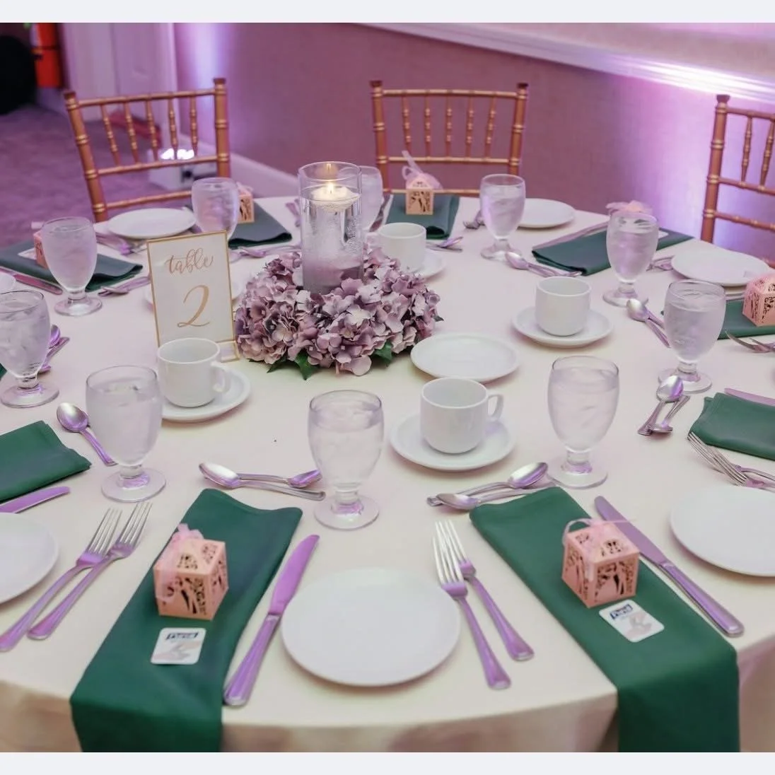 Round banquet table decorated with a candle centerpiece surrounded by pink hydrangeas, purple and green napkins, white plates and cups, water glasses, and silverware, set for a formal event with a table number sign reading '2'.